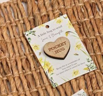 - Mini wooden heart token attached which reads - 'Pocket Hug'