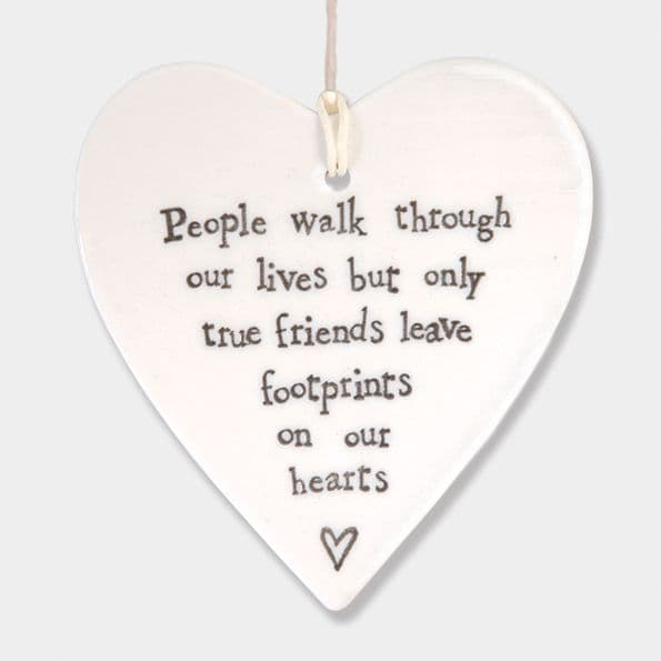 Made with porcelain, this beautiful heart is a lovely decoration for the home. It hangs easily with its attached piece of twine and comes in neutral colouring with its cream colour base and indented typical East of India black text - ideal for most rooms in the house.'People walk through our lives but only true friends leave footprints on our heart'