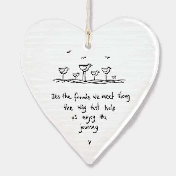 Made with porcelain, this beautiful ribbed heart is a lovely decoration for the home. It hangs easily with its attached piece of twine and comes in neutral colouring with its white/cream colour base and indented typical East of India black text - ideal for most rooms in the house.It reads