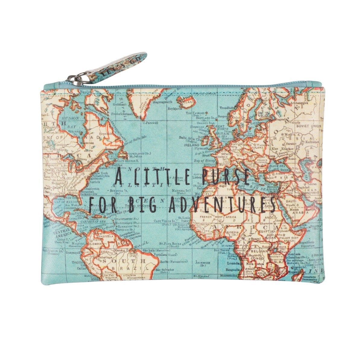 DESCRIPTIONWe love the Vintage Map collection by Sass & Belle and this little purse is a must have for anyone who loves to travel! It has aqua blue and burnt amber tones and on the front it reads -